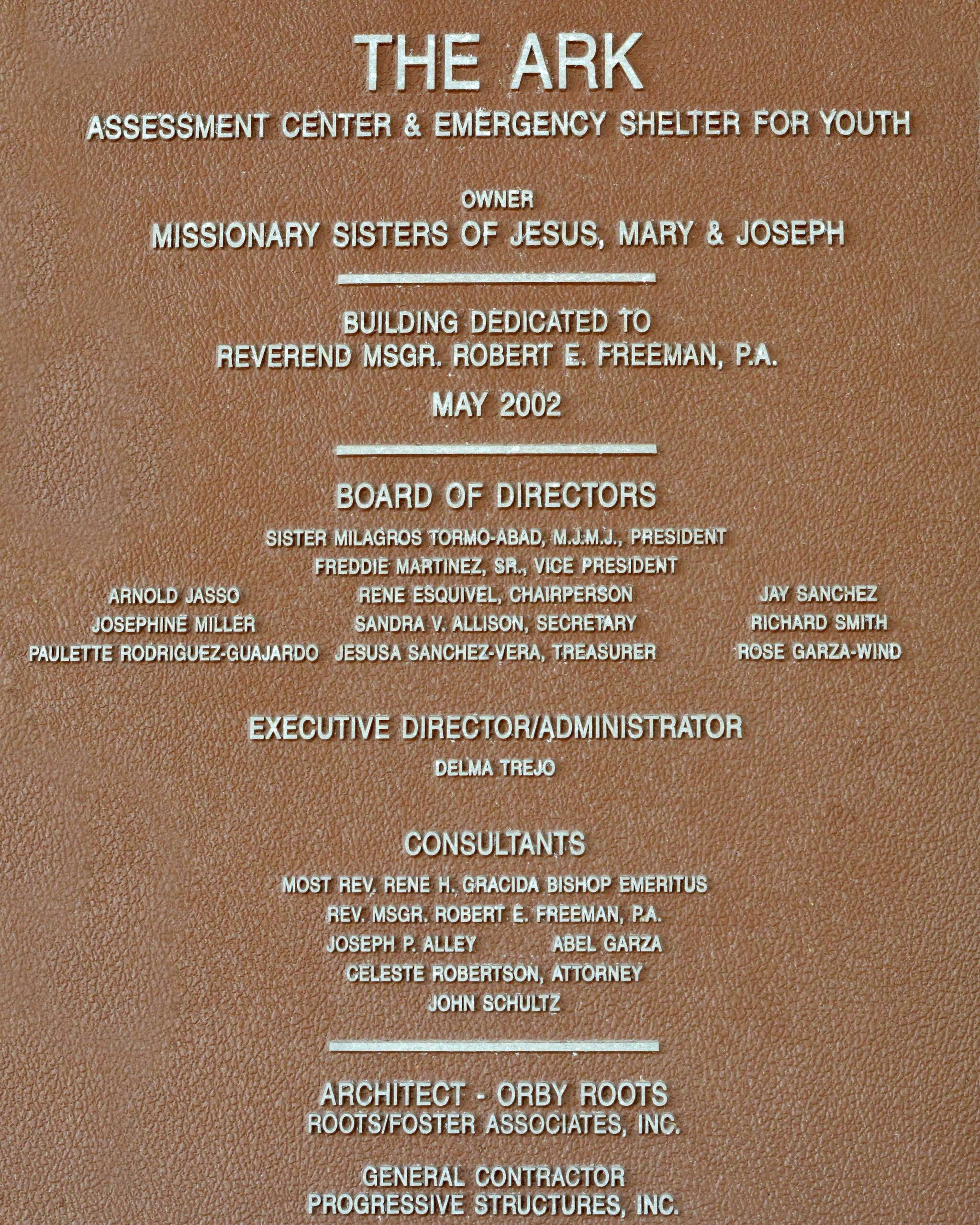 The Ark was dedicated to Rev. Msgr. Robert E. Freeman, P.A. on May 15, 2002.